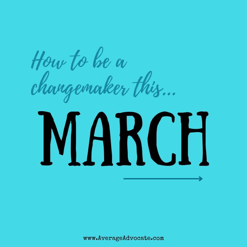 Like I said earlier, March has a plethora of very impact-focused days. I am all about not reinventing the wheel, overcoming hindrances, complications, and engaging in changemaking the easiest possible way from our real and busy lives. This is why I want to make sure you have these!